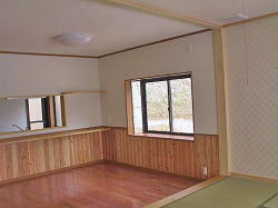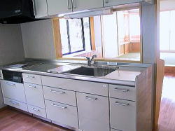 【施工内容】 古いキッチンを撤去して、対面式の明るいシステムキッチンにリフォームしました。 同時に、キッチンと手前の部屋は、天井・床・壁に断熱材を入れ、フローリングのリビングにリフォームしました。 |